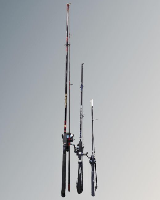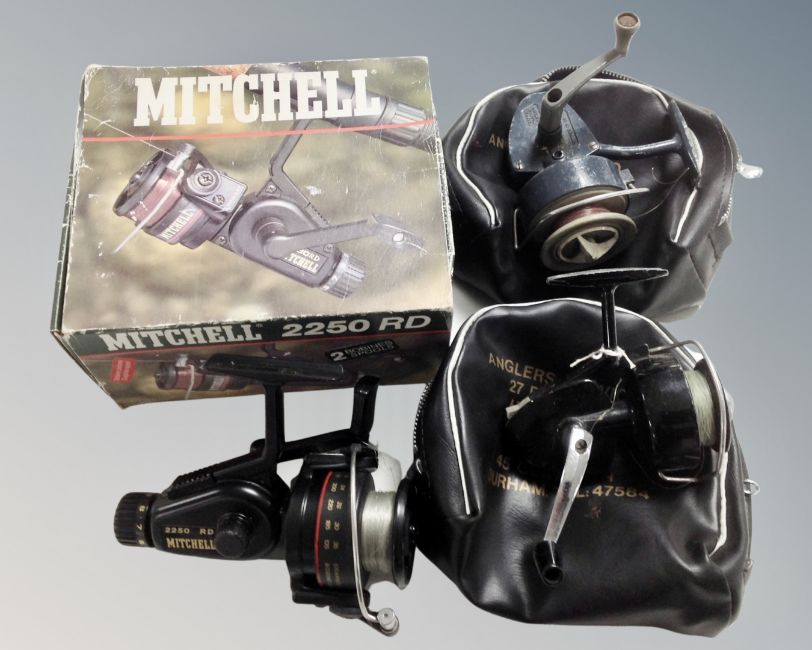 Three two piece fishing rods with reels including Shakespeare and Fladen together with a further box containing three fishing reels including Mitchell.