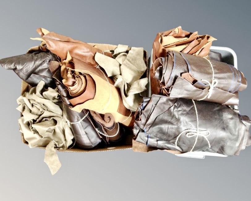 Two boxes containing leather offcut pieces.