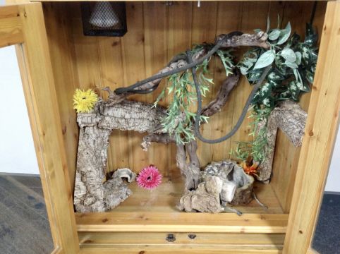 A pine double door glazed cabinet converted to a vivarium with accessories