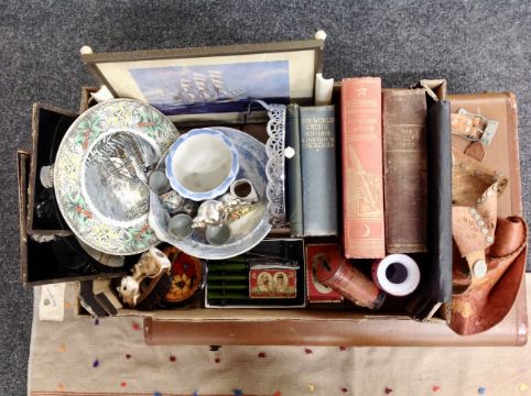 A vintage Antler luggage case containing a Canadian Red Cross blanket, a child's tooled leather cowboy hat and holster, a further box containing antique and later books including The Quiver 1878, assorted ceramics, tins etc.