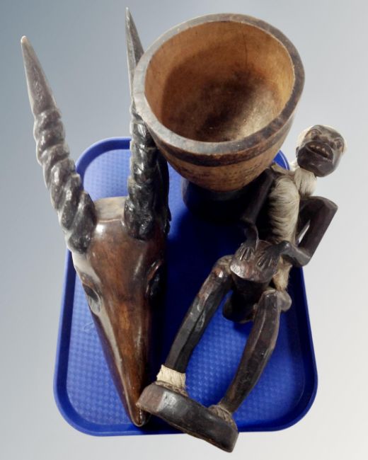 A tray containing African carvings including figure, animal head and bowl.