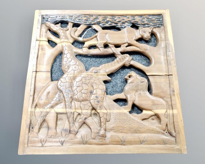 A carved hardwood frieze panel depicting African wildlife, 69cm by 69cm