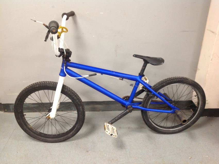 A BMX bike with rear stunt pegs.