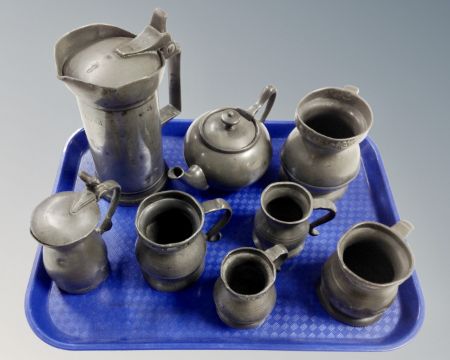 A tray containing antique pewter pieces including measuring jugs demi-litre tankard, miniature teapot.