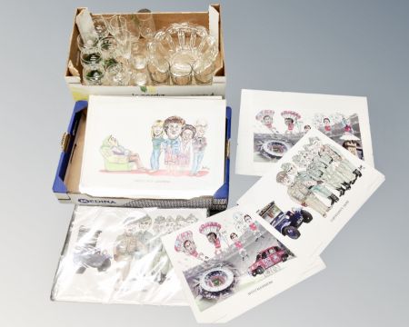 Two boxes containing assorted glassware and Stucartoons caricature prints.