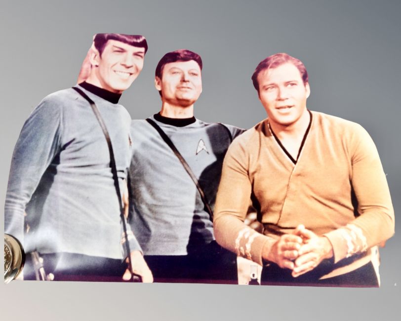A box containing Star Wars collectibles including vintage rolled poster, calendars, books, DVD box sets, a model of the USS Enterprise on stand.