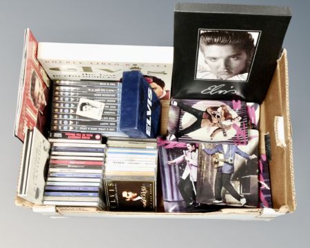 A box containing Elvis collectibles including a set of five collector's plates with shelf, DVD box sets, CDs, collectors edition magazines etc.