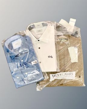 A Charles Tyrwhitt gent's pure cotton shirt, blue, size 15.5 ", together with a Next gent's pure cotton shirt, white, size 15.5 ", a Woolovers pure lambswool gent's cardigan, navy blue, size medium, and a Woolovers pure lambswool gent's cardigan, brown, size medium, all four items brand new with tags. (4)