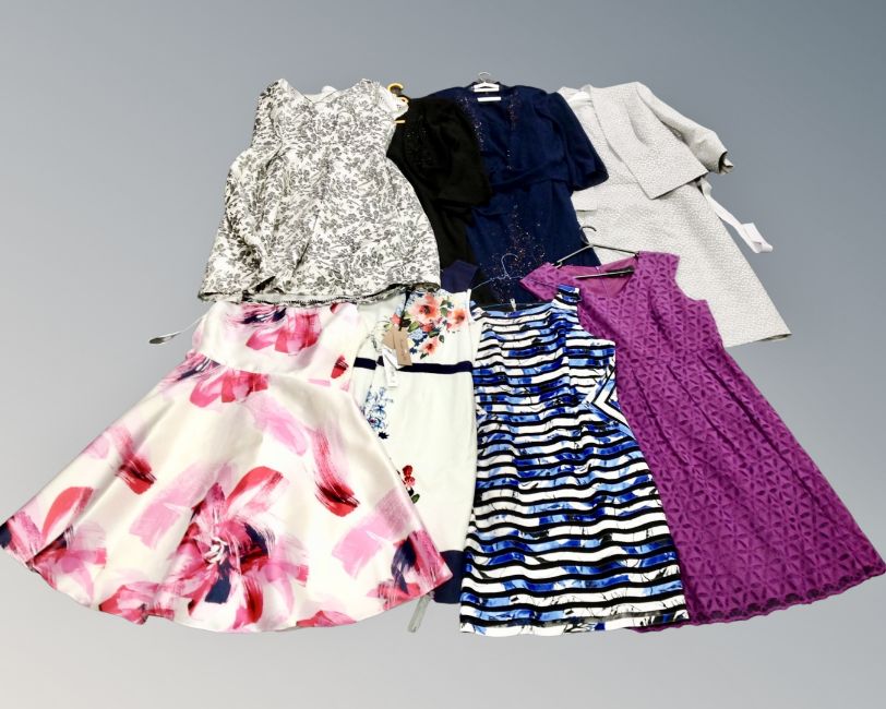 Seven assorted lady's formal dresses and two piece suits including Jacques Vert, Roman, Phase 1 etc.