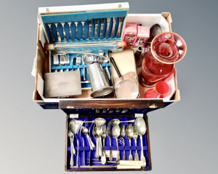 A box containing vintage glass rolling pin, glass vases, plated wares, canteens of cutlery.
