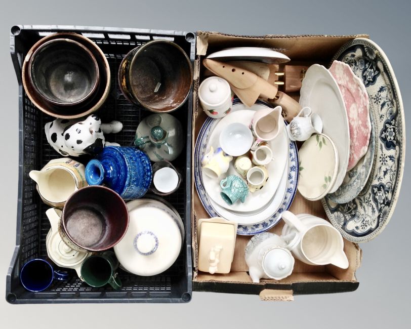 A box and a crate containing antique and later ceramics including meat plates, dinnerware, egg cup holders, West German plant pots etc.