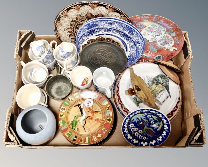 A box containing assorted ceramics Wade whimsies, Venetian glass animal figures, wall plates etc.