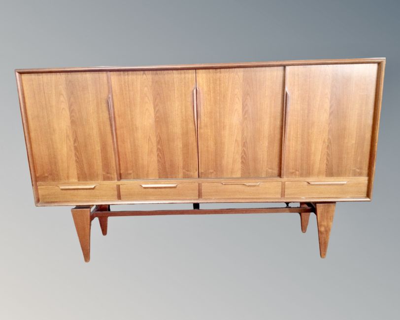 A Scandinavian teak sliding door sideboard on raised legs. (length 200cm)