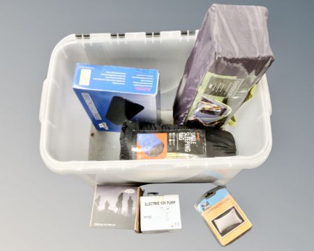 A box containing camping equipment including two person tent, sleeping bag, digital filter kit, air bed etc.