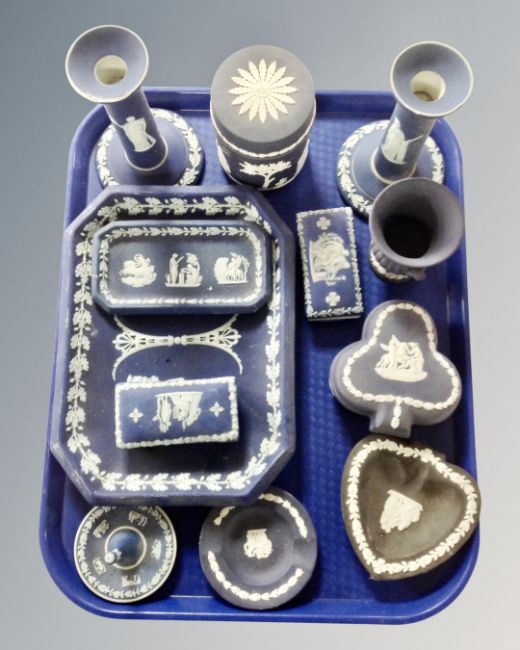 A tray containing 12 pieces of Wedgwood Jasperware.