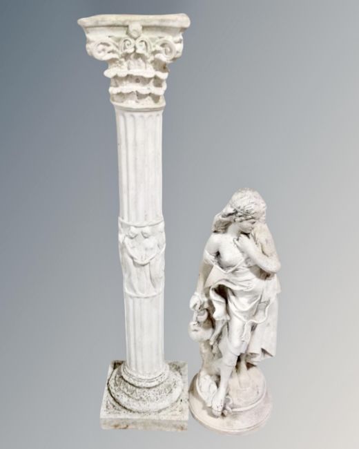 A concrete garden figure of a water carrier on plinth