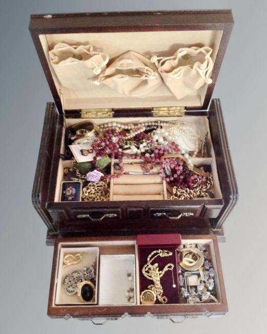 A jewellery box and contents including gilt costume jewellery, bead necklaces, wristwatches, brooches etc.