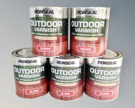 Five tins Ronseal outdoor varnish gloss, 750ml.