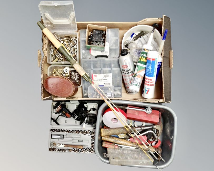 A box containing plastic storage boxes and organizers containing socket set pieces, screws, bolts, hand tools, a two piece fishing rod and fishing reels.