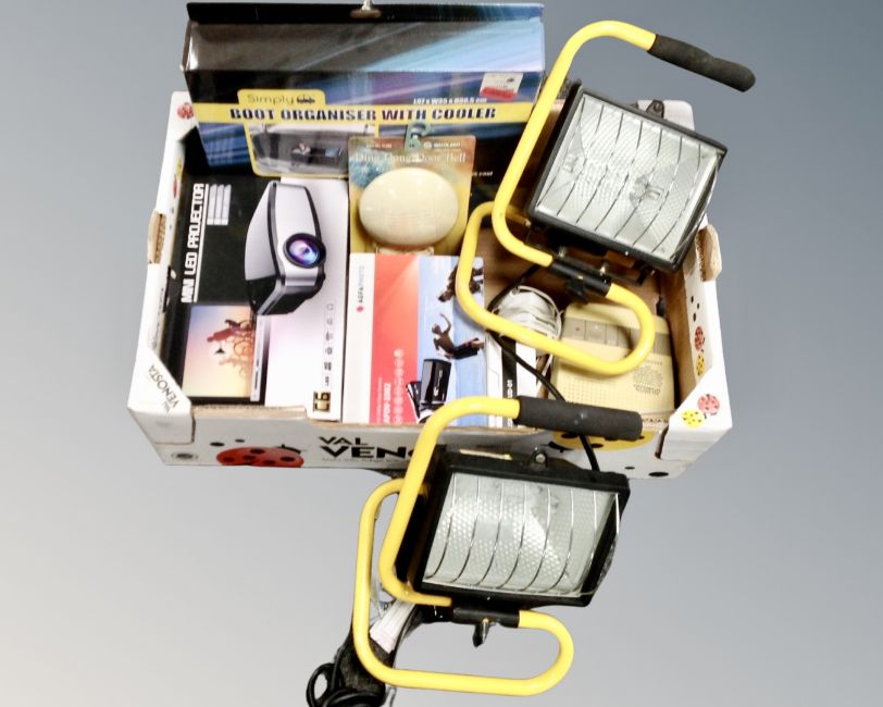 A box containing a pair of work lights, a car boot organizer, a mini LED projector, an Agfa video camera etc.