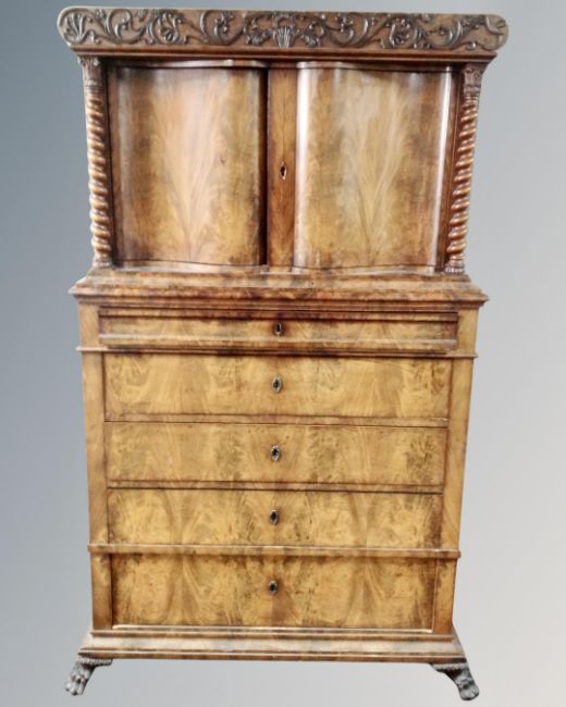A 19th century continental flame mahogany double door drinks cabinet, fitted with five drawers beneath and raised on paw feet. (width 116cm)
