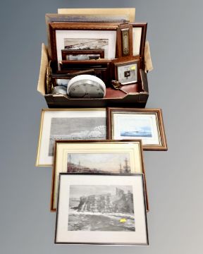 A box containing assorted pictures and prints, framed photographs, Art Deco barometer, a Metamec battery operated wall clock, gent's leather cased travel set.