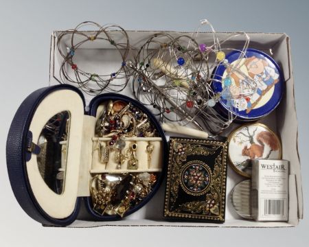 A tray containing trinket and jewellery boxes containing assorted costume jewellery, dress rings, novelty golf pen, plated spoons etc.