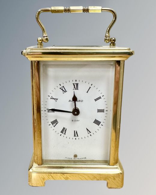 A French Bayard brass-cased eight day carriage clock, height 14cm overall.