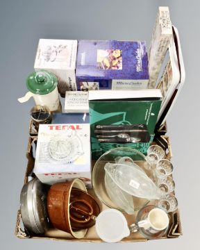 Two boxes containing kitchenalia, Viners cutlery set, mini fridge, pans etc.