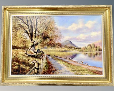 Contemporary school : River with hills beyond, textured colour print on canvas, numbered 55 of 350, dated '05, 50cm by 75cm.