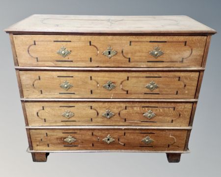 A 19th century inlaid oak chest of four drawers. (width 111cm)