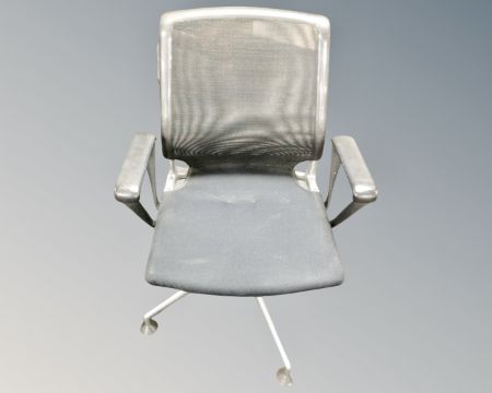 A Geprufte Sicherheit Vitra metal framed fabric and mesh upholstered swivel office armchair