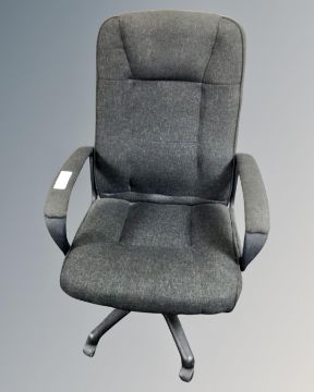A black fabric upholstered swivel office chair