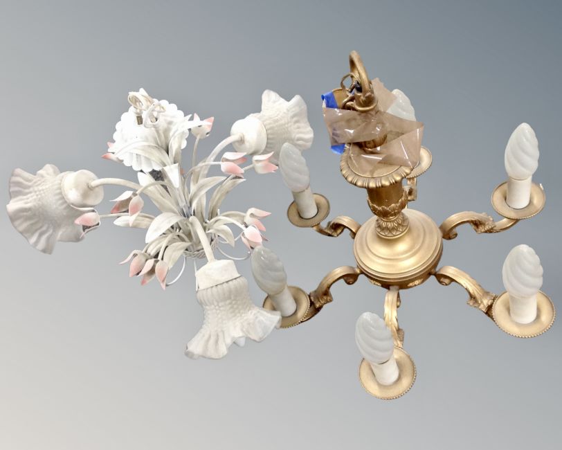 A contemporary metal three way light fitting with glass shades together with a further gilt metal six way light fitting.