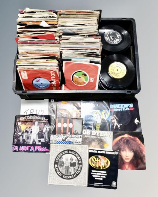A crate of vinyl 7 inch singles, Wings, The Police, Kate Bush, Fleetwood Mac, PInk Floyd, Iron Maiden, Deep Purple etc