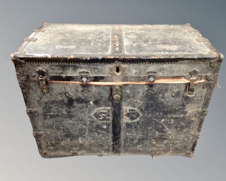 An antique metal bound shipping trunk