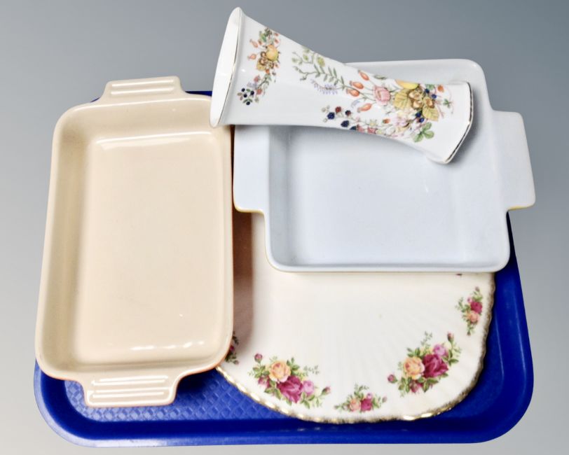 A tray of Royal Albert Country roses cake plate, Aynsley vase, ceramics Le Creuset oven dish, further oven dish