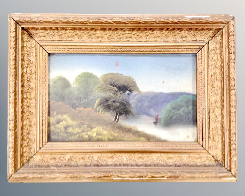 An antiquarian oil on card depicting a boat on river in rural landscape in gilt frame