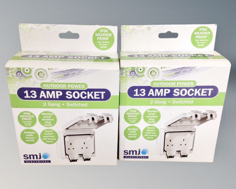Four SMJ electrical outdoor powered 13 Amp sockets, boxed.