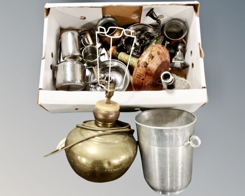 A box of assorted metal ware, copper jugs, candlesticks, stainless steel tea ware, brass lamp and ice bucket