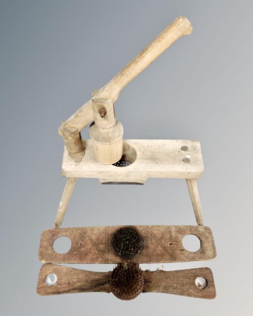 A vintage wooden apple press together with a flax comb