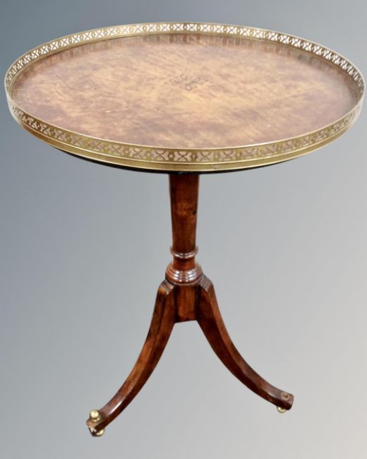 A stained beech wood circular pedestal wine table with leather inset panel and brass gallery