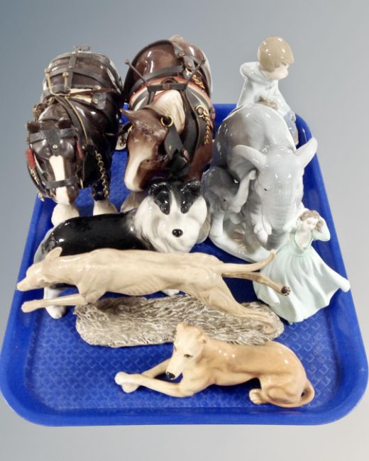 A tray of ceramic ornaments, shire horses, Coalport figure etc
