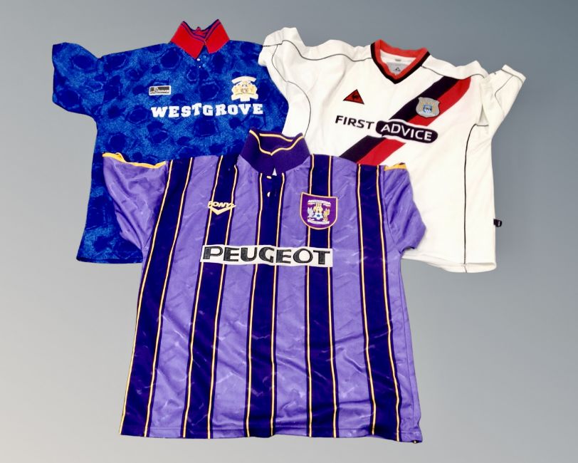 Three football tops including Manchester City away 2002/03, Coventry City away 1995/96 and Halifax town home shirt 1994/95
