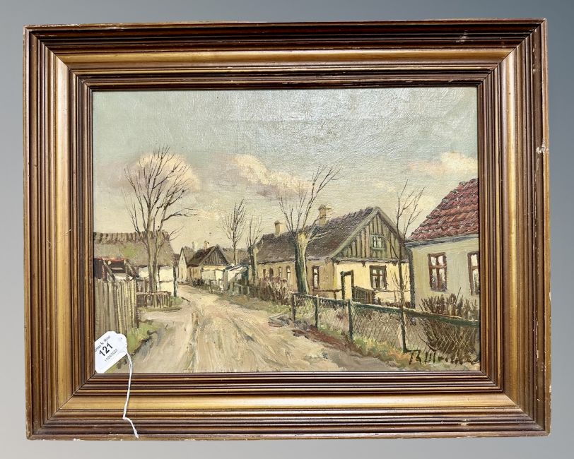 Continental school : Buildings by a fence, oil on canvas, 39cm by 29cm