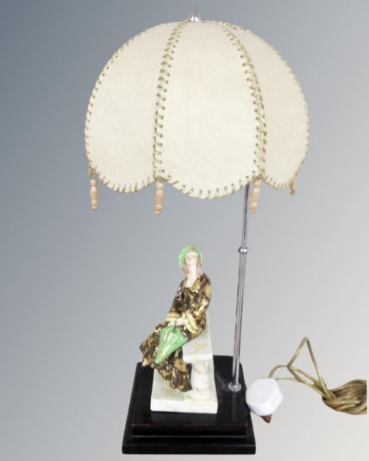 A 1930's porcelain figural table lamp with shade on wooden stand