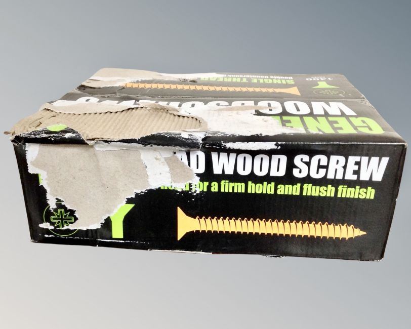 A box of 2400 single thread wood screws, double counter sunk