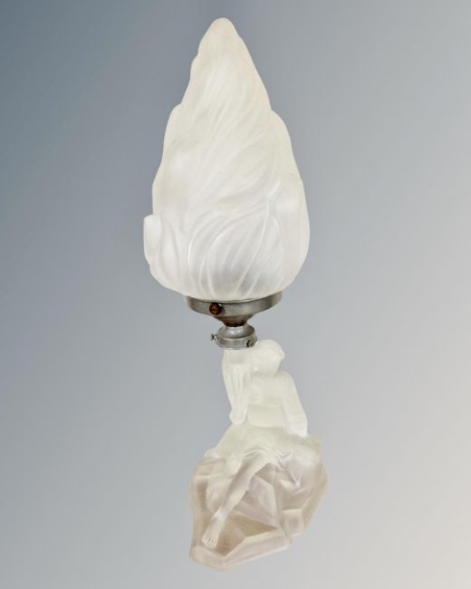 An Art Deco figural glass table lamp with flame shade