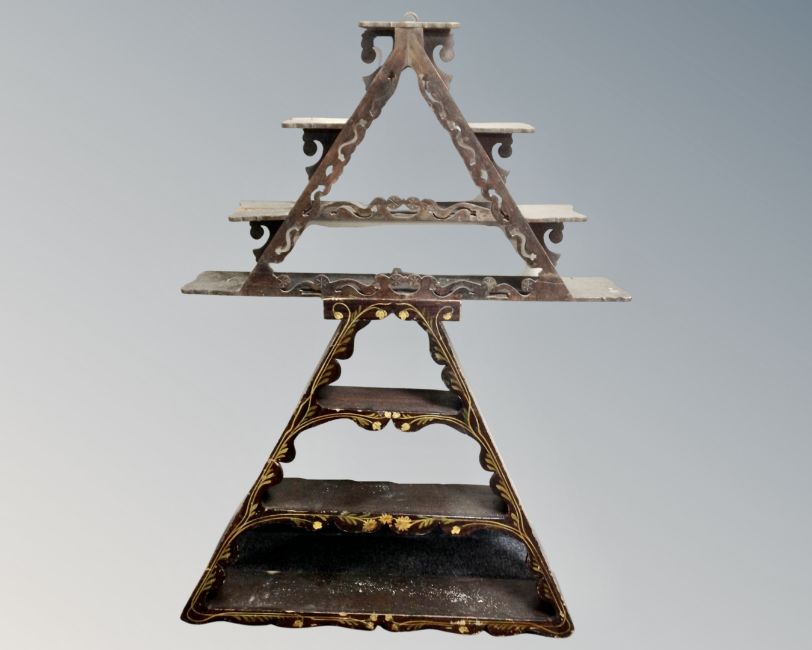 Two antique triangular wall shelves