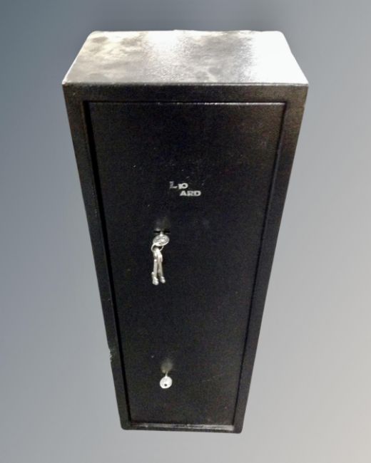 A metal gun cabinet with keys